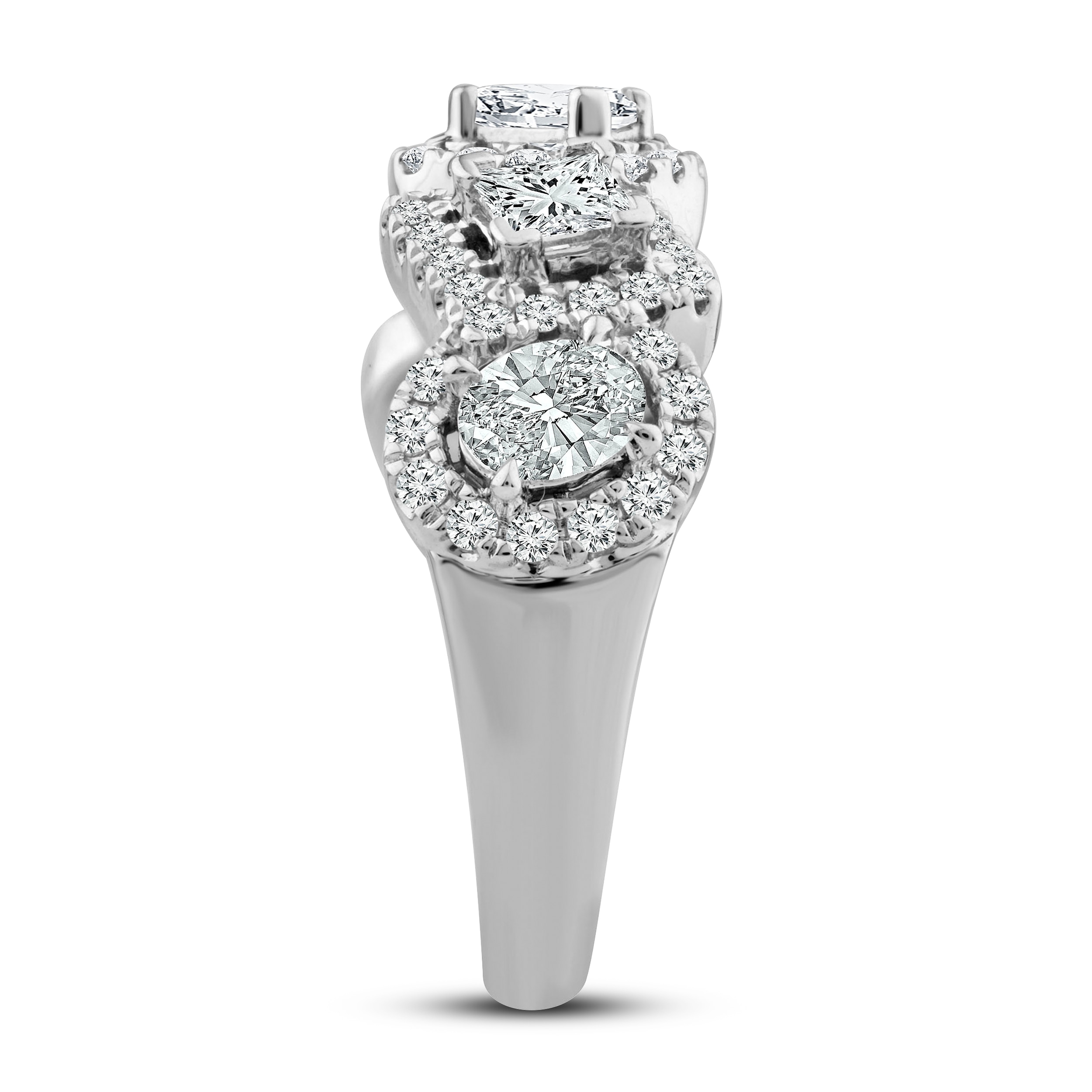 This striking diamond ring collection features five distinctively-shaped diamonds, symbolic of everything she means to you. Each diamond shape has a different meaning, from integrity and wisdom, to confidence, totality, and elegance. This gorgeous 10K white gold ring features a pear-shaped, round-cut, emerald-cut, princess-cut, and oval-cut diamond, each surrounded by a frame of sparkling round-cut diamonds. The ring has a total diamond weight of 1 3/4 carats.